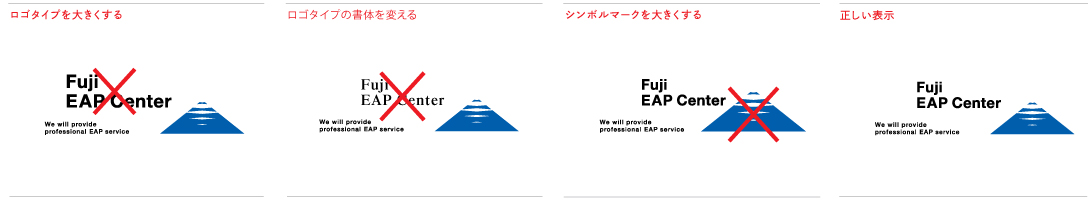 ロゴマークの表示禁止例です。ロゴマークを構成するデザイン要素のサイズ、書体を変えることを禁止しています。